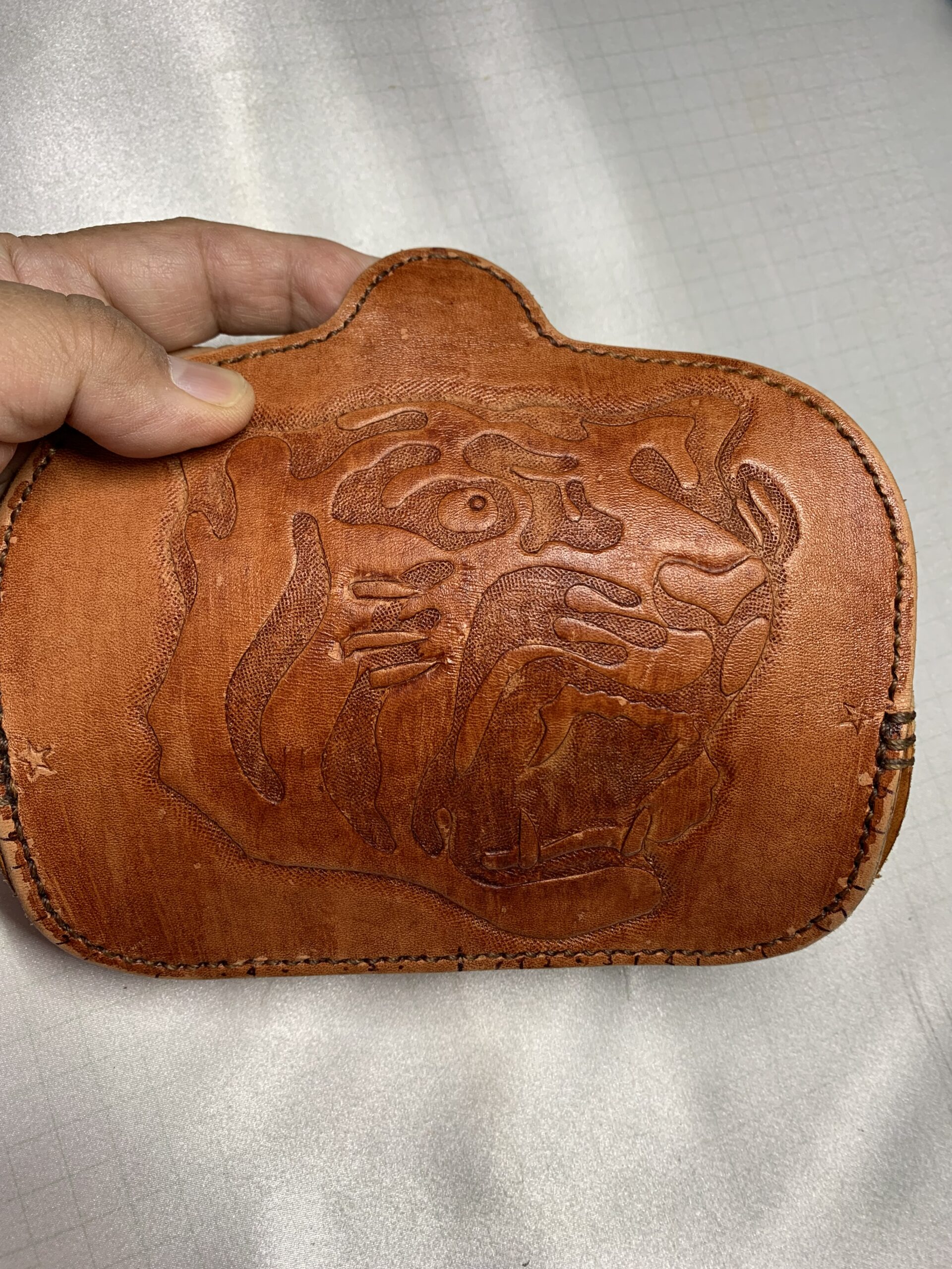 牛革にデザインし染料はライトブラウンで染色しました