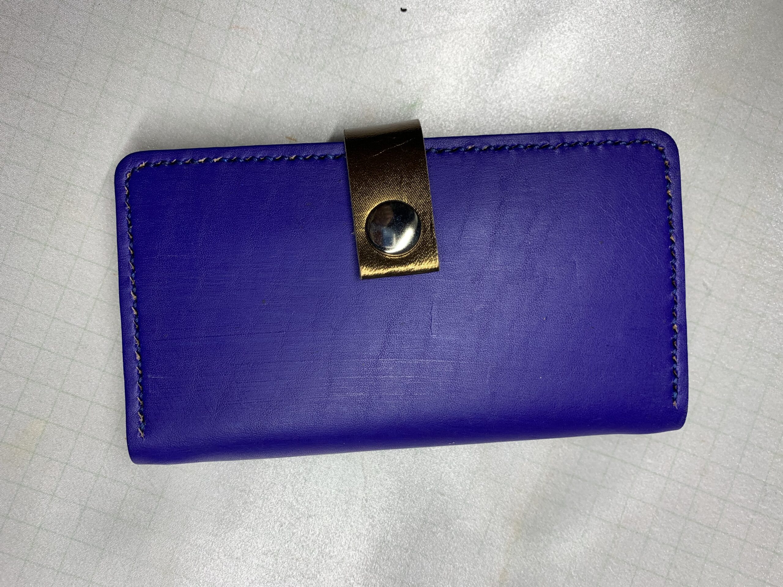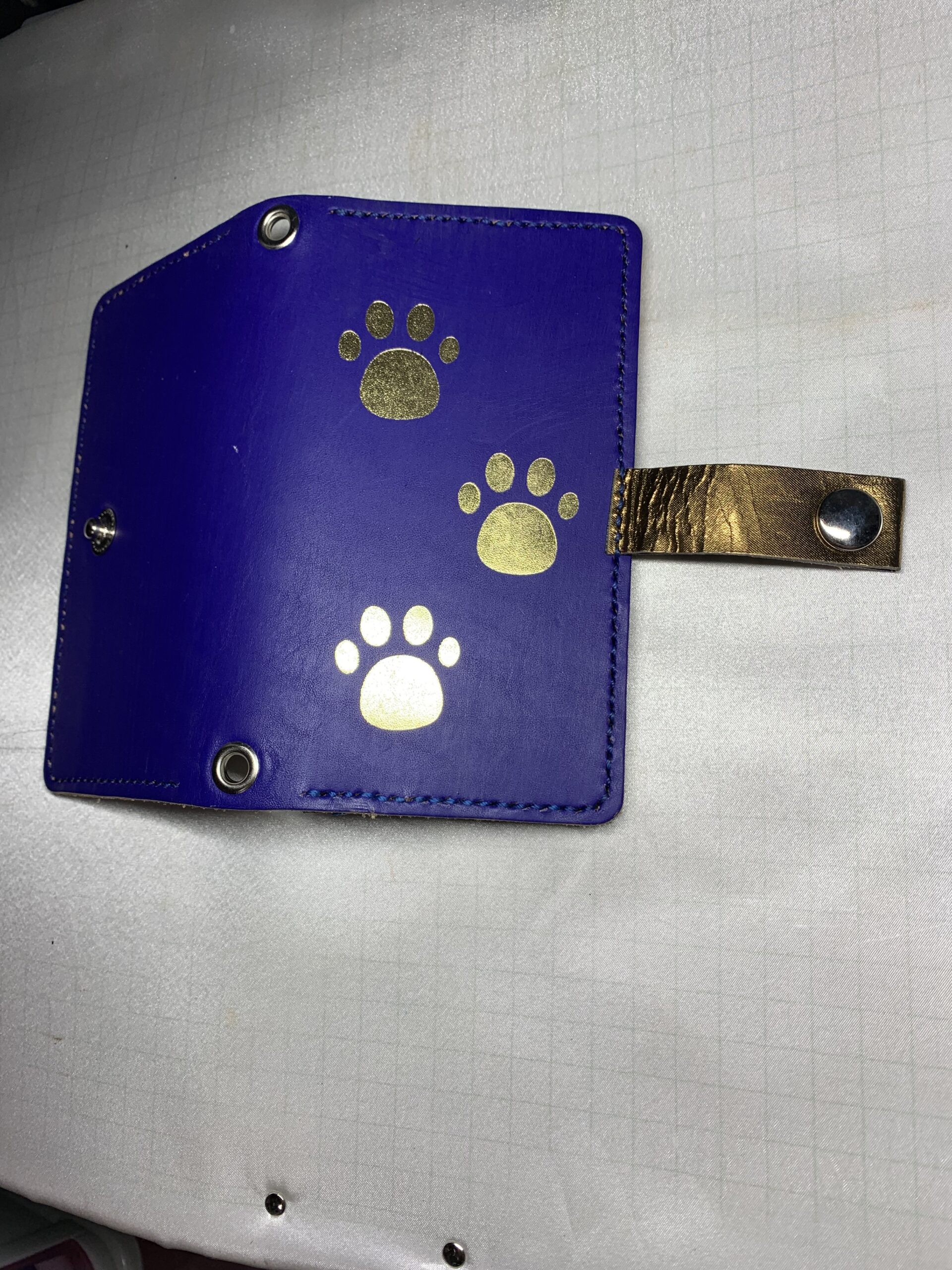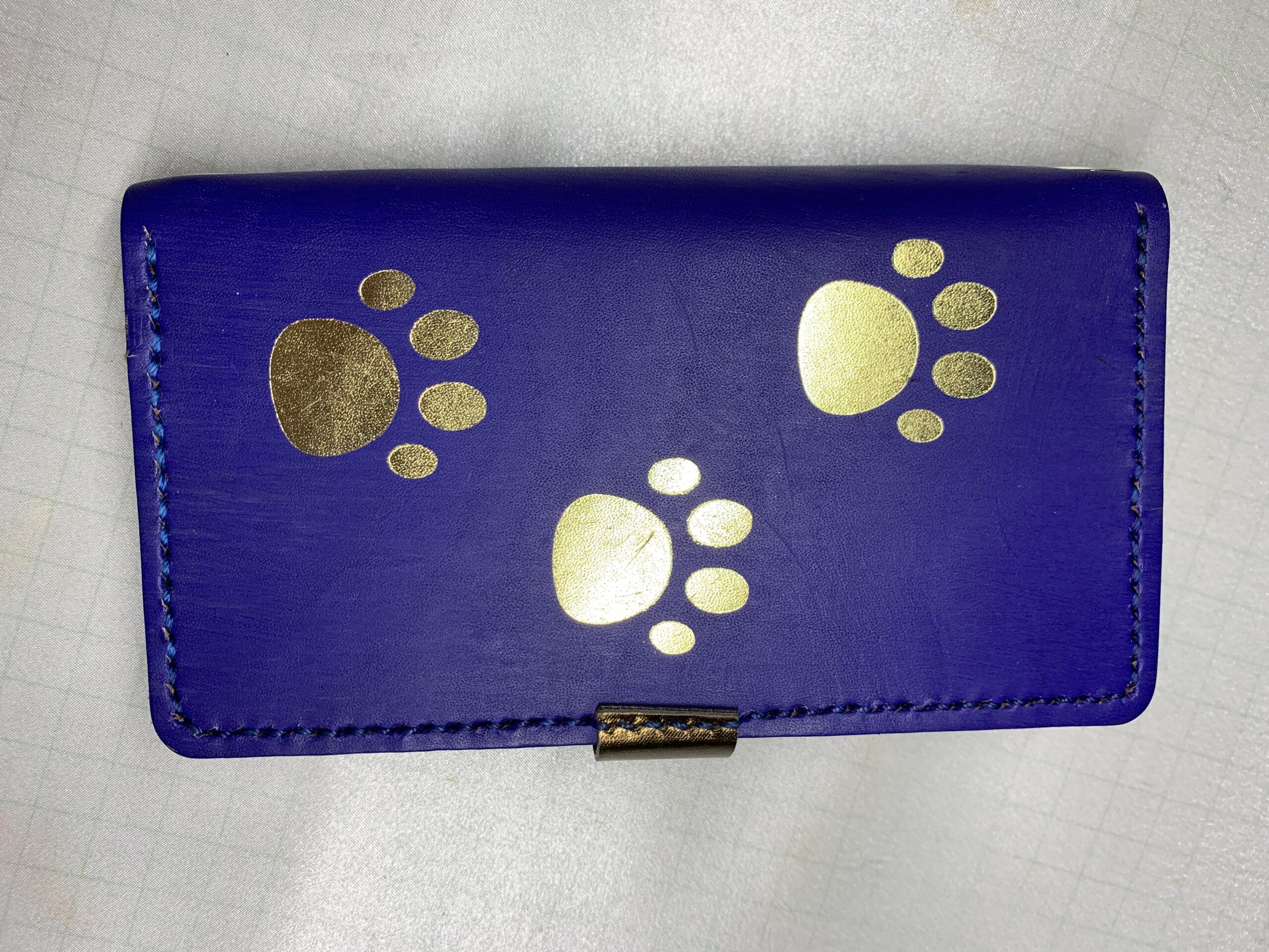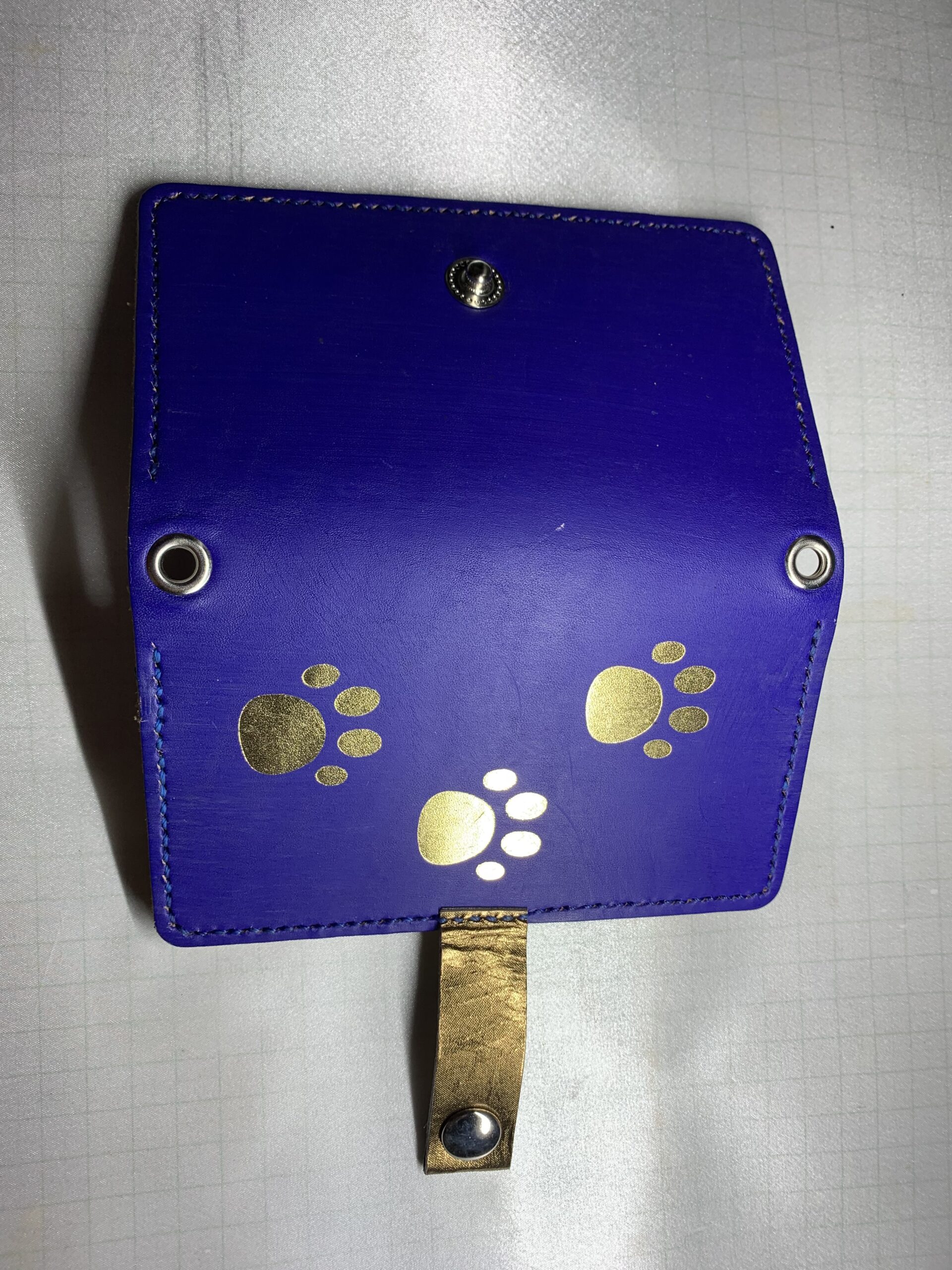 青色に染色された牛ヌメ革に金箔のネコちゃんの可愛らしい足跡