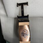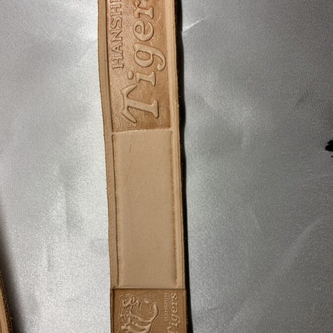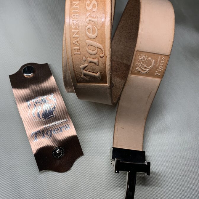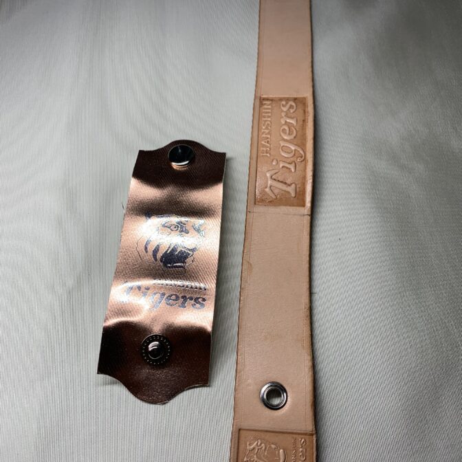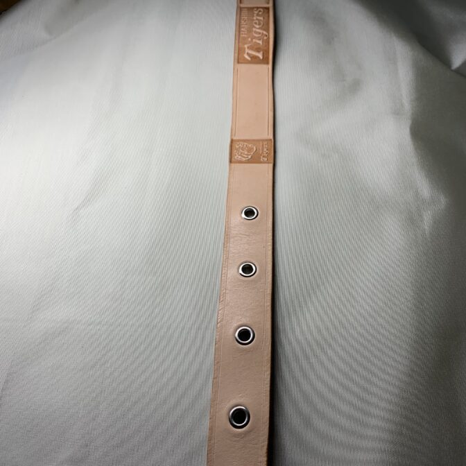 牛なめし革ベルトにTigersのロゴが数カ所入っています